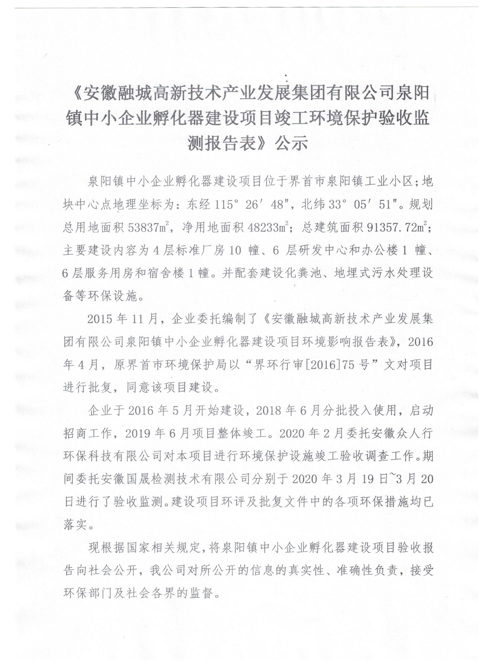 《安徽融城高新技術(shù)產(chǎn)業(yè)發(fā)展集團有限公司泉陽鎮(zhèn)中小企業(yè)孵化器建設(shè)項目竣工環(huán)境保護驗收監(jiān)測報告表》公示